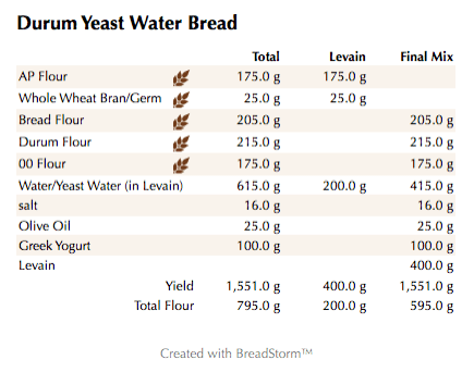 I used some fresh milled and sifted Durum flour along with KAF bread flour and Caputo 00 flour.  For some extra crumb softness I added Greek yogurt and olive oil as well.  The sifted out germ and bran from the Durum flour was soaked in some of the water for the dough and added back in the final mix.