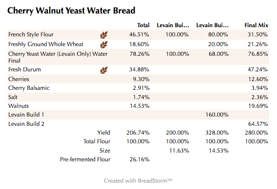 It took a few days to bring the YW to life with a handful of cherries, water and a little honey. Once it was ready to use I built up a levain in 2 stages and used a nice combination of flours including freshly milled whole wheat and durum flour.