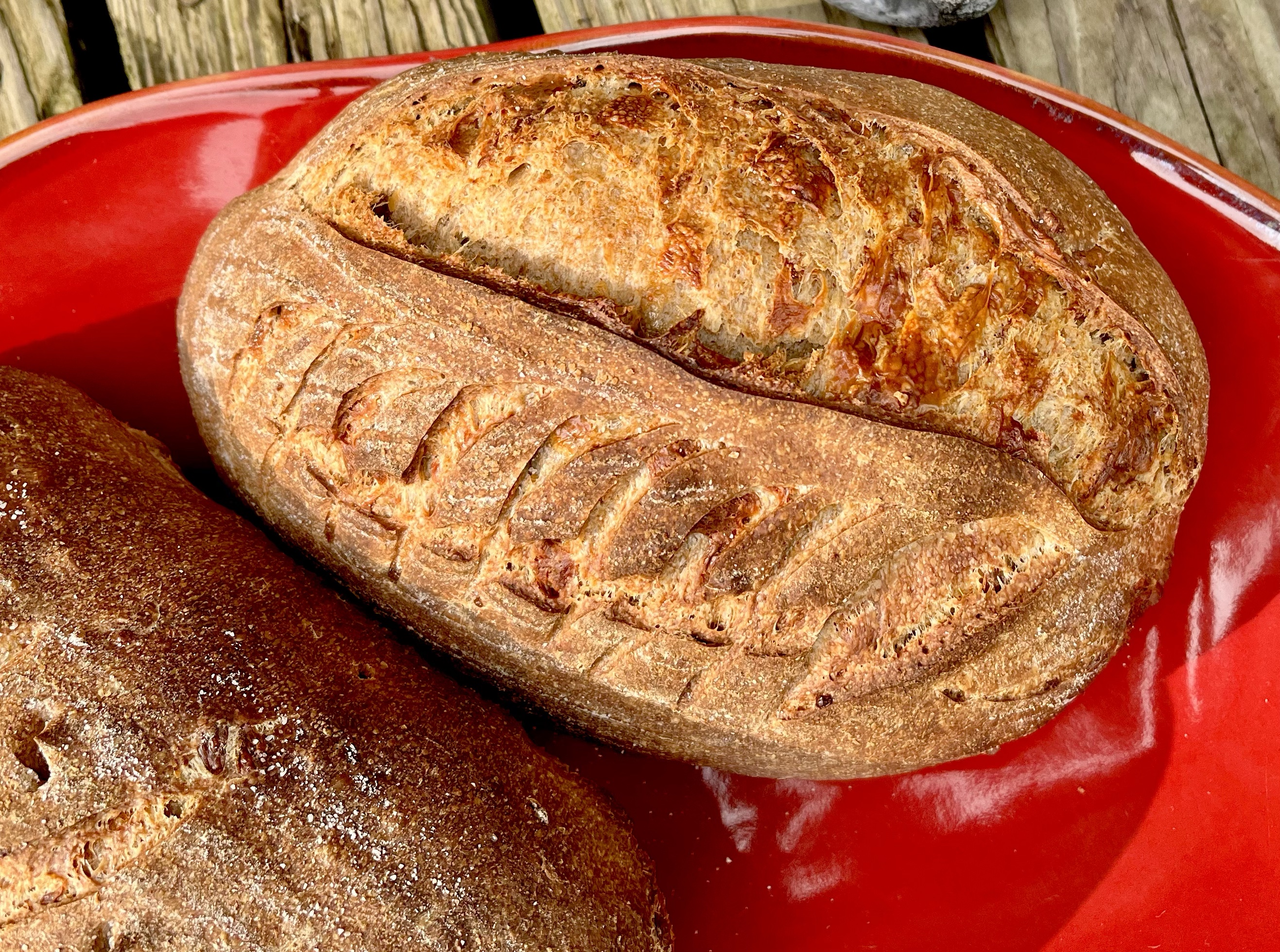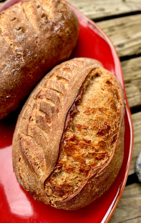Lower the temperature to 450 degrees. Bake for 35-50 minutes until the crust is nice and brown and the internal temperature of the bread is 205 degrees.