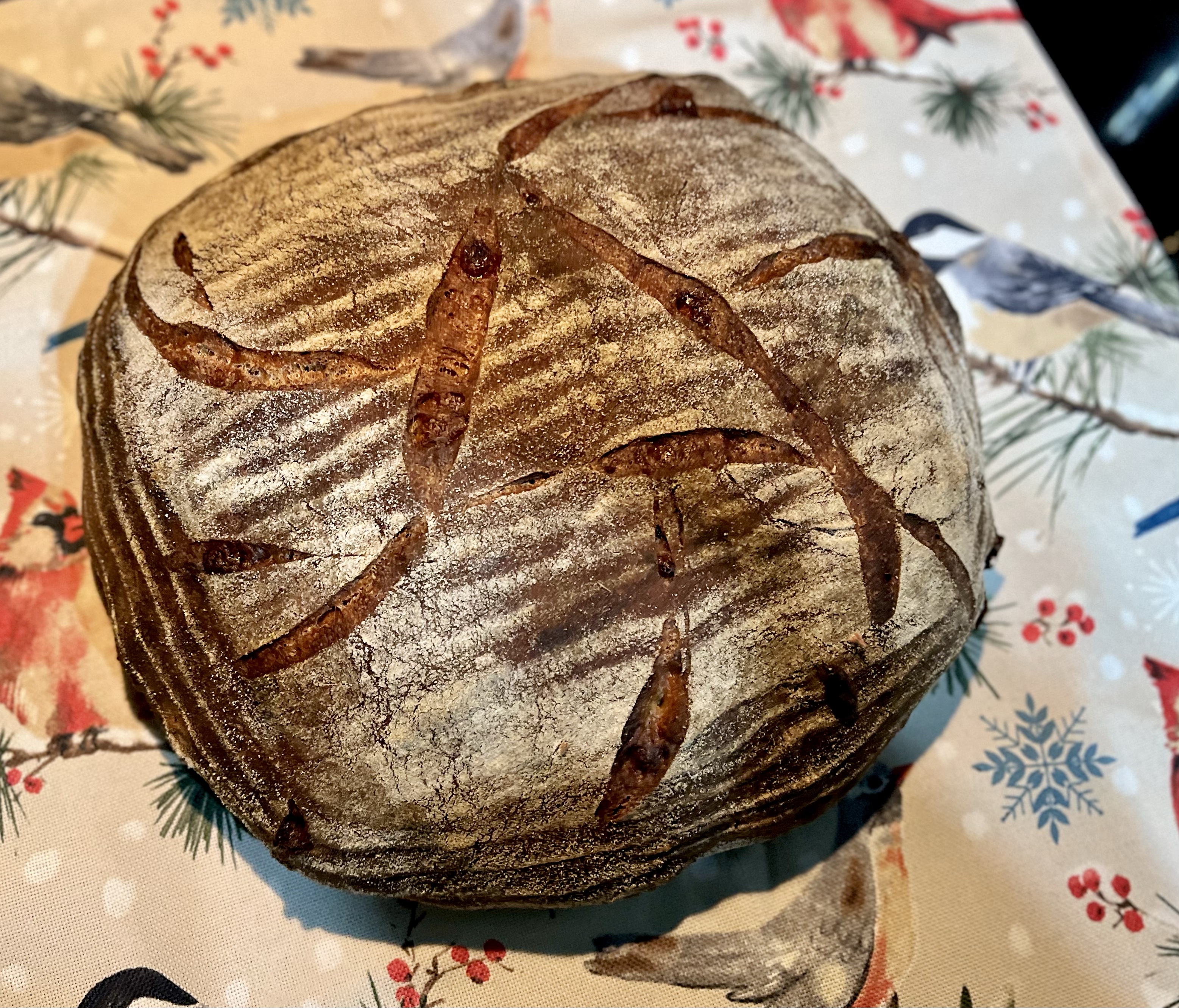 When you are ready to bake, an hour beforehand, preheat your oven to 540°F and prepare for steam. Let your dough sit at room temperature while the oven is warming up. When ready to bake, score as desired. Prepare your oven for steam. I have a heavy-duty baking pan on the bottom rack of my oven with 1 baking stone above the pan and one on the top shelf.  I pour 1 cup of boiling water into the pan right after I place the dough in the oven.  I then lower the temperature of the oven to 450°F for a miche or 455°F for smaller individual loaves. Bake until they are nice and brown and the internal temperature is at least 205 – 210°F.