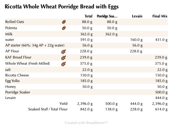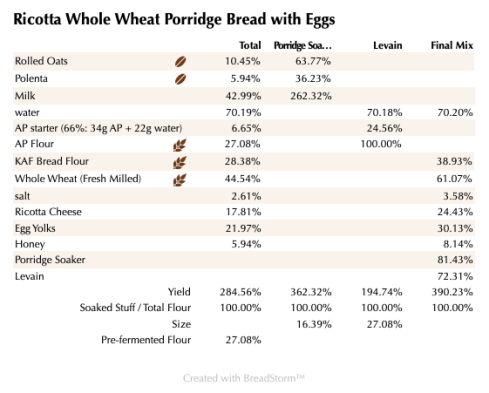 Mix the flours and the water for about 1 minute. Let the rough dough sit for about 20 minutes to an hour. Next add the levain, cooled porridge, eggs, ricotta cheese,honey and salt and mix on low for 5 minutes. Remove the dough from your bowl and place it in a lightly oiled bowl or work surface and do several stretch and folds. Let it rest covered for 10-15 minutes and then do another stretch and fold. Let it rest another 10-15 minutes and do one additional stretch and fold. After a total of 2 hours place your covered bowl in the refrigerator and let it rest for 12 to 24 hours. (Since I used my proofer I only let the dough sit out for 1.5 hours before refrigerating).