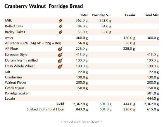 I made a similar version of this bread over Thanksgiving but never had a chance to post it. I changed a few things including increasing the hydration and used walnuts instead of pecans. I wanted to really bring out the nutty flavor in this one and used barley flakes along with rolled oats for the porridge. The Greek Yogurt was added for a little extra sour edge and I find it adds a little extra creamy texture to the final loaf.