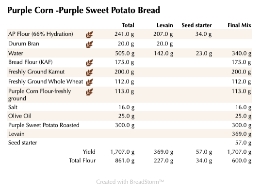 I’m really loving purple bread! I’ve made a similar bread a few months ago, but this time I decided to also add freshly ground purple corn. I also used Kamut instead of the previously used Spelt.