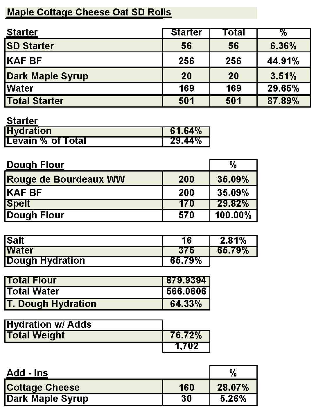 More dark maple syrup was also added along with some rolled oats and cottage cheese. The total hydration of the dough takes the 81% water content of the cottage cheese and 33% water content of the maple syrup. The dough was nicely hydrated and very silky after fully mixing.
