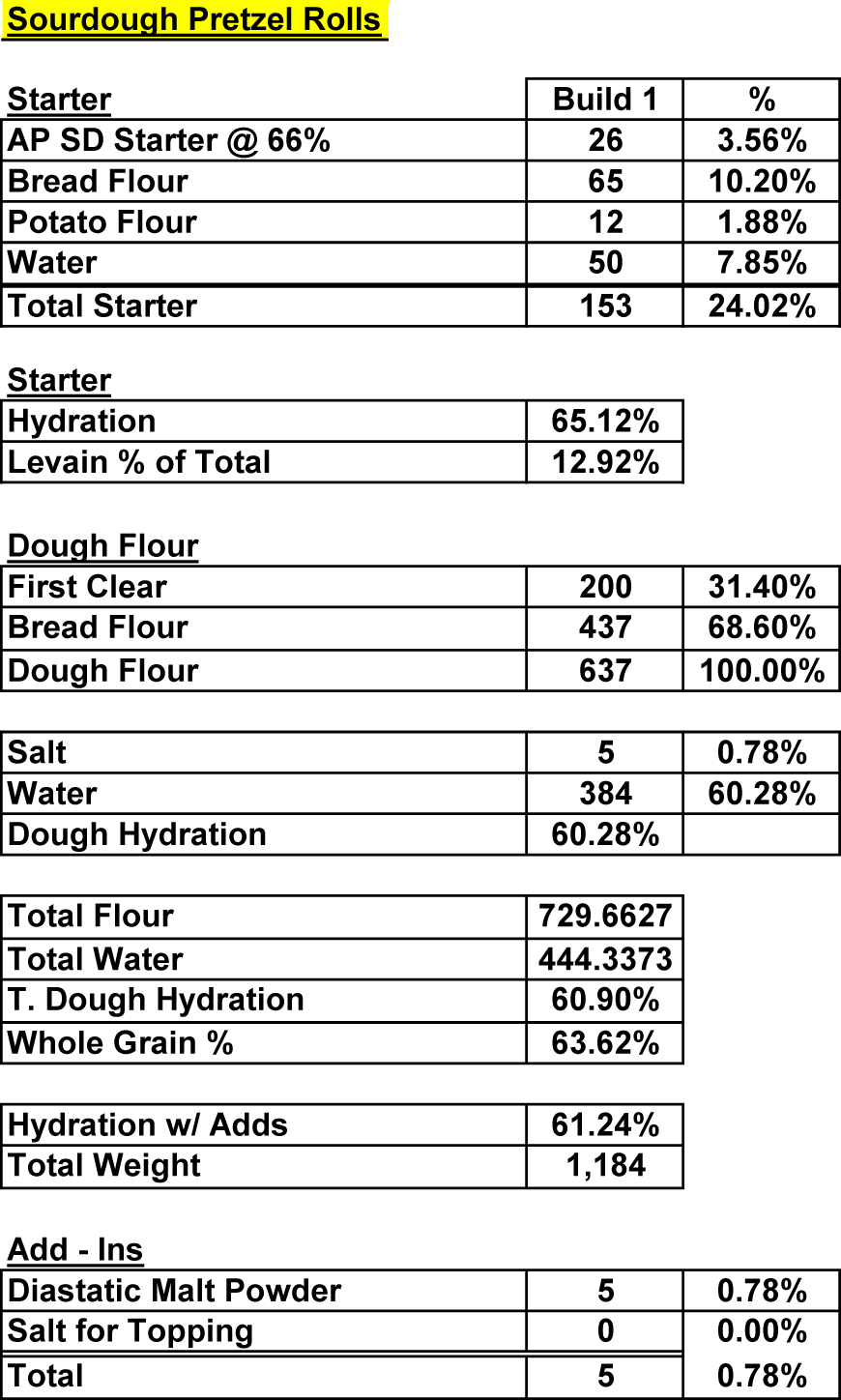 Main-Shot  My pretzel rolls have become one of my wife’s and friends favorites so I figured it was time to make some more.  I stuck to the same basic formula and procedure as before but changed up some of the flour using some potato flour in the starter and some First Clear flour in the main dough.
