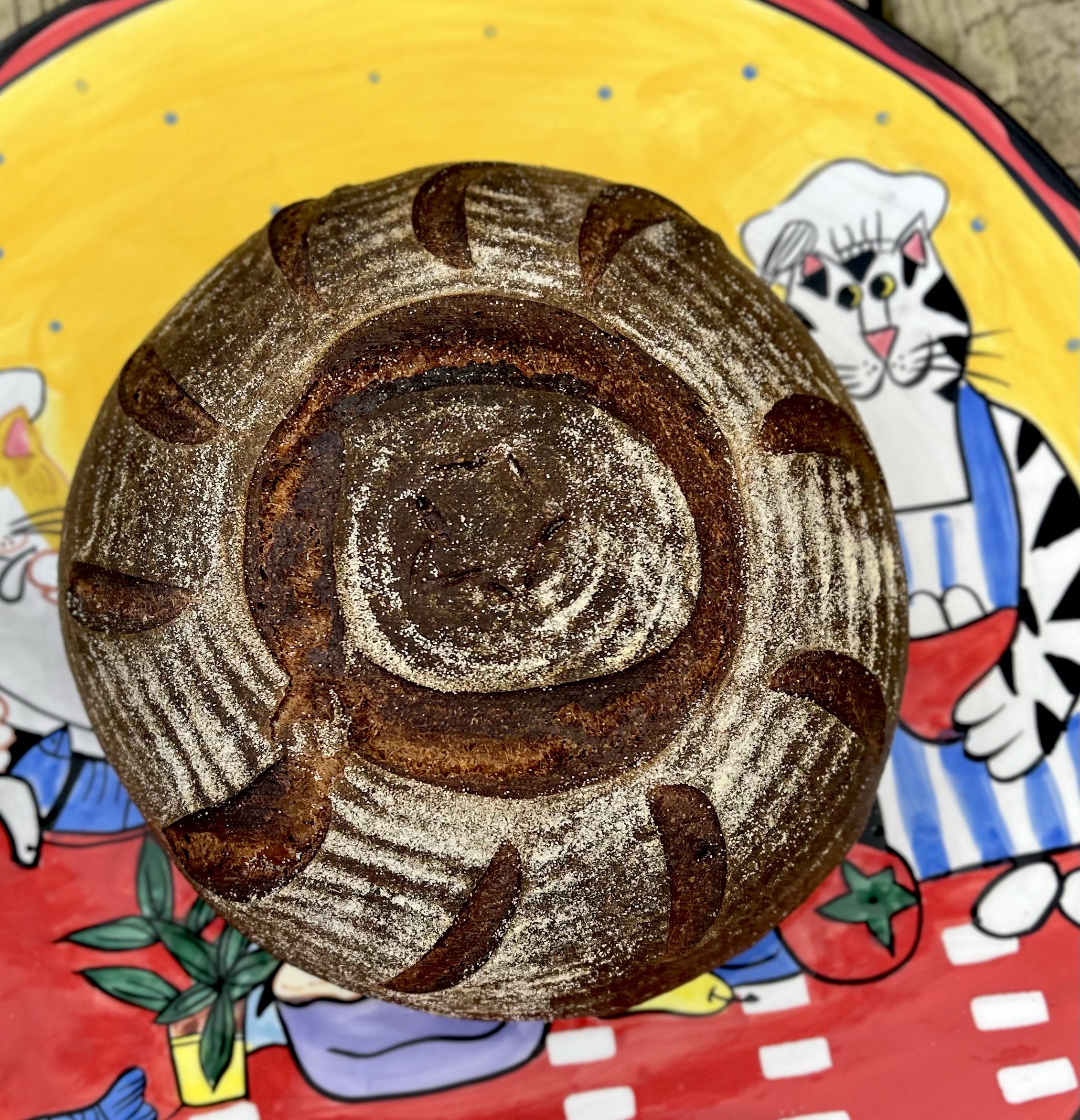 I baked this as one big miche and it took quite some time to finish baking.  The crumb is tight but the bread is pretty tasty with the fresh milled whole wheat and rye.  I ran out of bread flour so I used some KAF High Gluten flour instead.