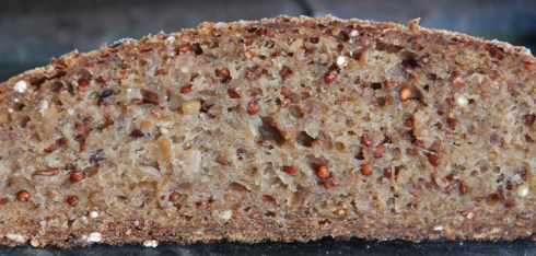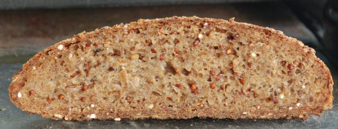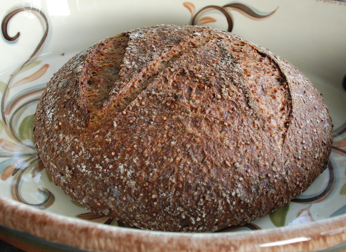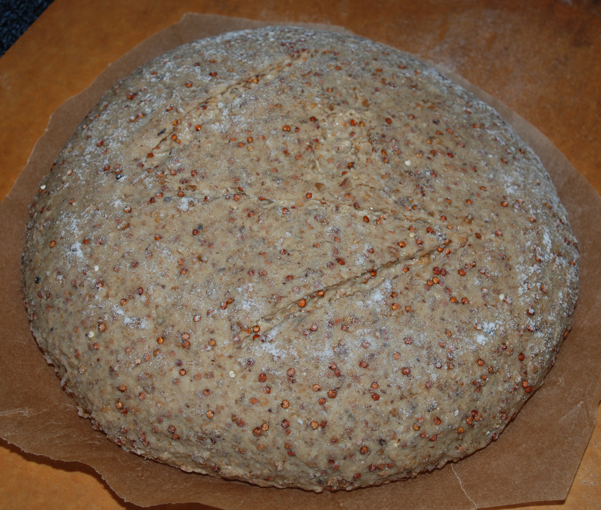 I rediscovered some interesting nut flours that I had in my refrigerator and decided to mix the toasted almond and hazelnut flours with some fresh milled rye flour. I really like the effect a soaker/scald has on a multi-grain bread so I mixed up some cracked wheat, red quinoa and bulgur wheat with some hot water. It is interesting how these ingredients sucked up every last bit of water as when I added them to the dough there was not a dry eye in the house or the bowl. The official way of calculating the hydration of a dough is to not include the water sucked up by the soaker, but I warn you this bread is a wet one especially due to the soaker.