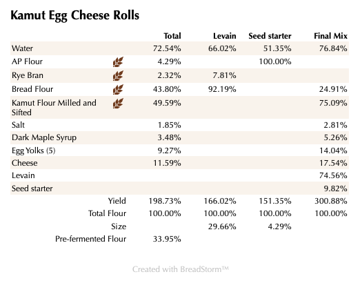 Mix the flours and the water for about 1 minute. Let the rough dough sit for about 20 minutes to an hour. Next add the levain, maple syrup, egg yolks, and salt and mix on low for 4 minutes. Now add the cheese or wait until you form the dough per my comments above. You should end up with a cohesive dough that is slightly tacky but very manageable. Remove the dough from your bowl and place it in a lightly oiled bowl or work surface and do several stretch and folds. Let it rest covered for 10-15 minutes and then do another stretch and fold. Let it rest another 10-15 minutes and do one additional stretch and fold. After a total of 1.5 hours place your covered bowl in the refrigerator and let it rest for 12 to 24 hours.