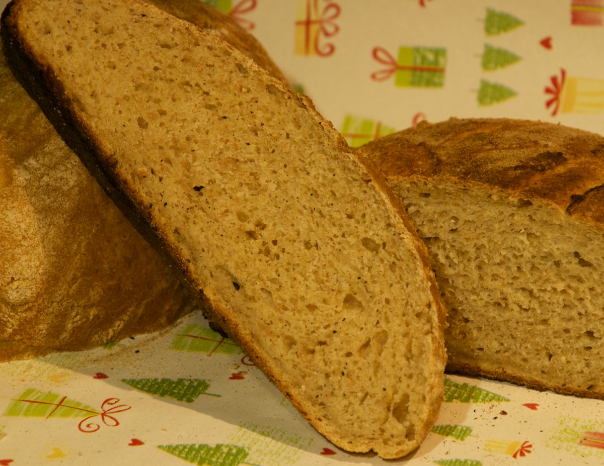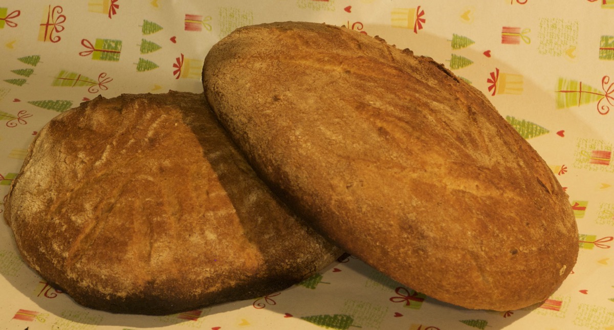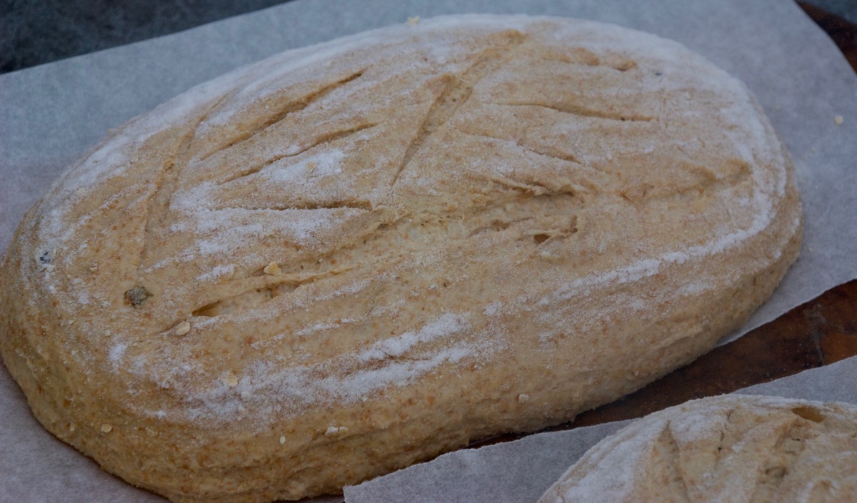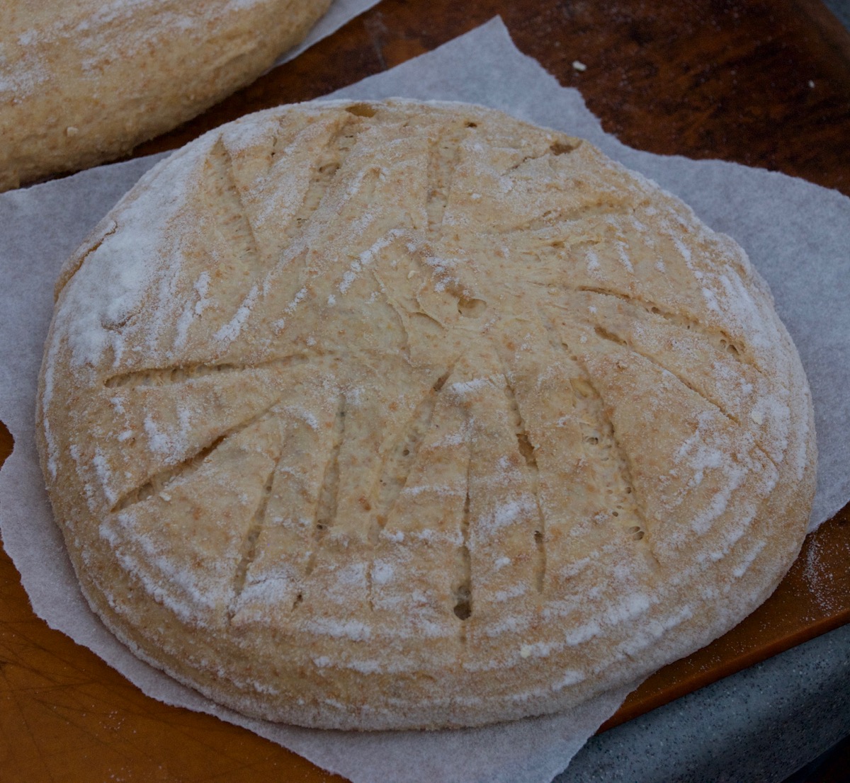 I used my Weber charcoal grill and added some Hickory wood chunks to get a nice smokey flavor and it really came through. I set the 2 charcoal baskets on each side of the kettle so I could bake the bread on indirect heat. The only issue I had was the parchment paper caught fire from the wood chunks flaming more than anticipated and burned the bottom of the loaves slightly.