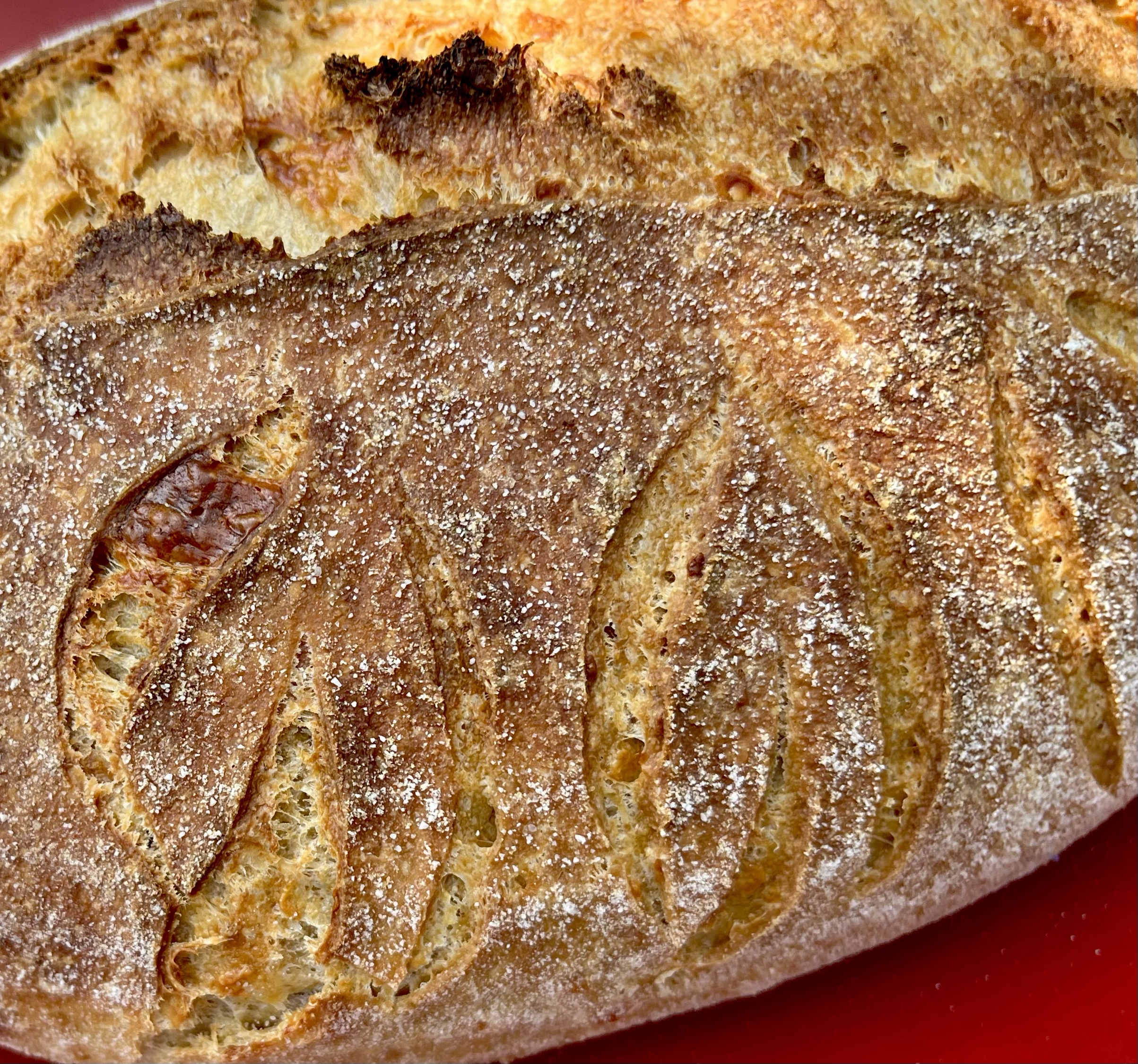 When you are ready to bake, preheat your oven to 540°F an hour beforehand and prepare for steam. Let your dough sit at room temperature while the oven is warming up. When ready to bake, score as desired. Prepare your oven for steam. I have a heavy-duty baking pan on the bottom rack of my oven with 1 baking stone above the pan and one on the top shelf. I pour 1 cup of boiling water into the pan right after I place the dough in the oven. I then lower the temperature of the oven to 450°F for a miche or 455°F for smaller individual loaves. Bake until they are nice and brown and the internal temperature is at least 205 – 210°F.