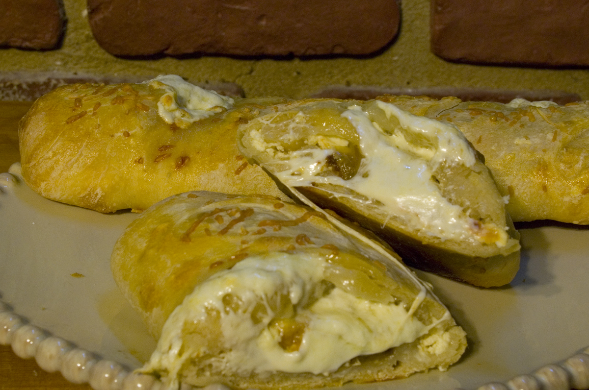 The second day I made some calzones using ricotta cheese, fresh mozzarella, caramelized onions, baked cheesy chicken and parmesan cheese.  I must say the calzones dough ended up very sour compared to the pizza the nigh before, but tasted great.