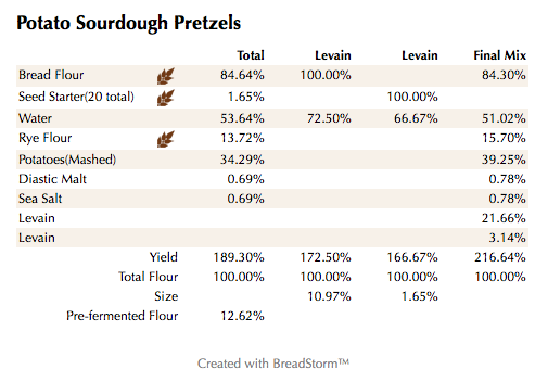 I love potatoes in my bread and rolls so I figured it was time to try them in pretzel rolls. I had to make this recipe twice as the first time I didn’t compensate enough for the moisture in the potatoes and the dough was way too hydrated. The rolls didn’t come out the right consistency so I made them again and cut the water back and they came out perfect.