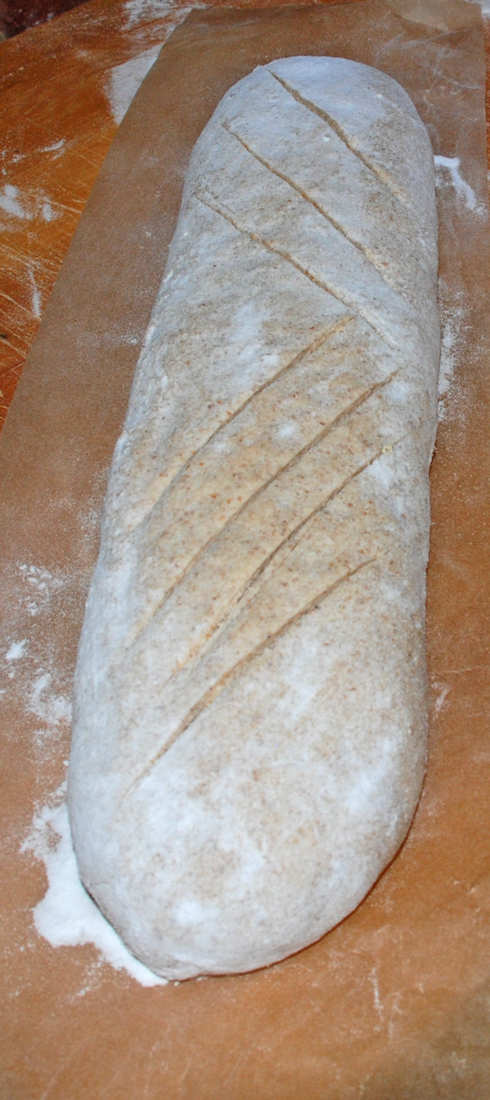 Slash loaves as desired and place empty pan in bottom shelf of oven.