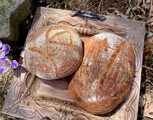 When you are ready to bake, an hour beforehand, preheat your oven to 540°F and prepare for steam. Let your dough sit at room temperature while the oven is warming up. When ready to bake, score as desired. Prepare your oven for steam. I have a heavy-duty baking pan on the bottom rack of my oven with 1 baking stone above the pan and one on the top shelf. I pour 1 cup of boiling water into the pan right after I place the dough in the oven. I then lower the temperature of the oven to 450°F for a miche or 455°F for smaller individual loaves. Bake until they are nice and brown and the internal temperature is at least 205 – 210°F.