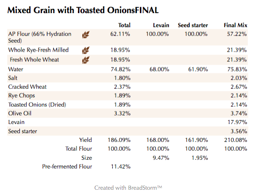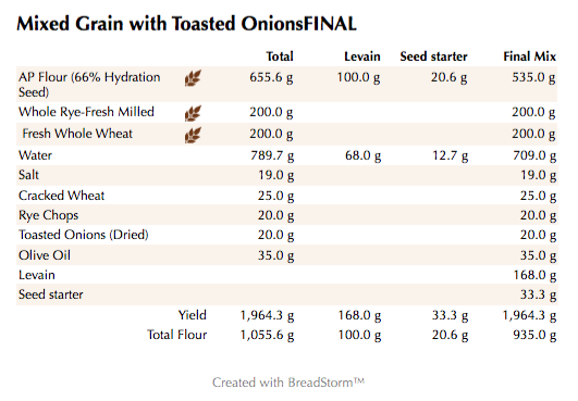 Add onions to water and let sit for 5 minutes to rehydrate. Add water mixture to flour and mix for 1 minute or less. Cover and autolyse for 30 minutes.