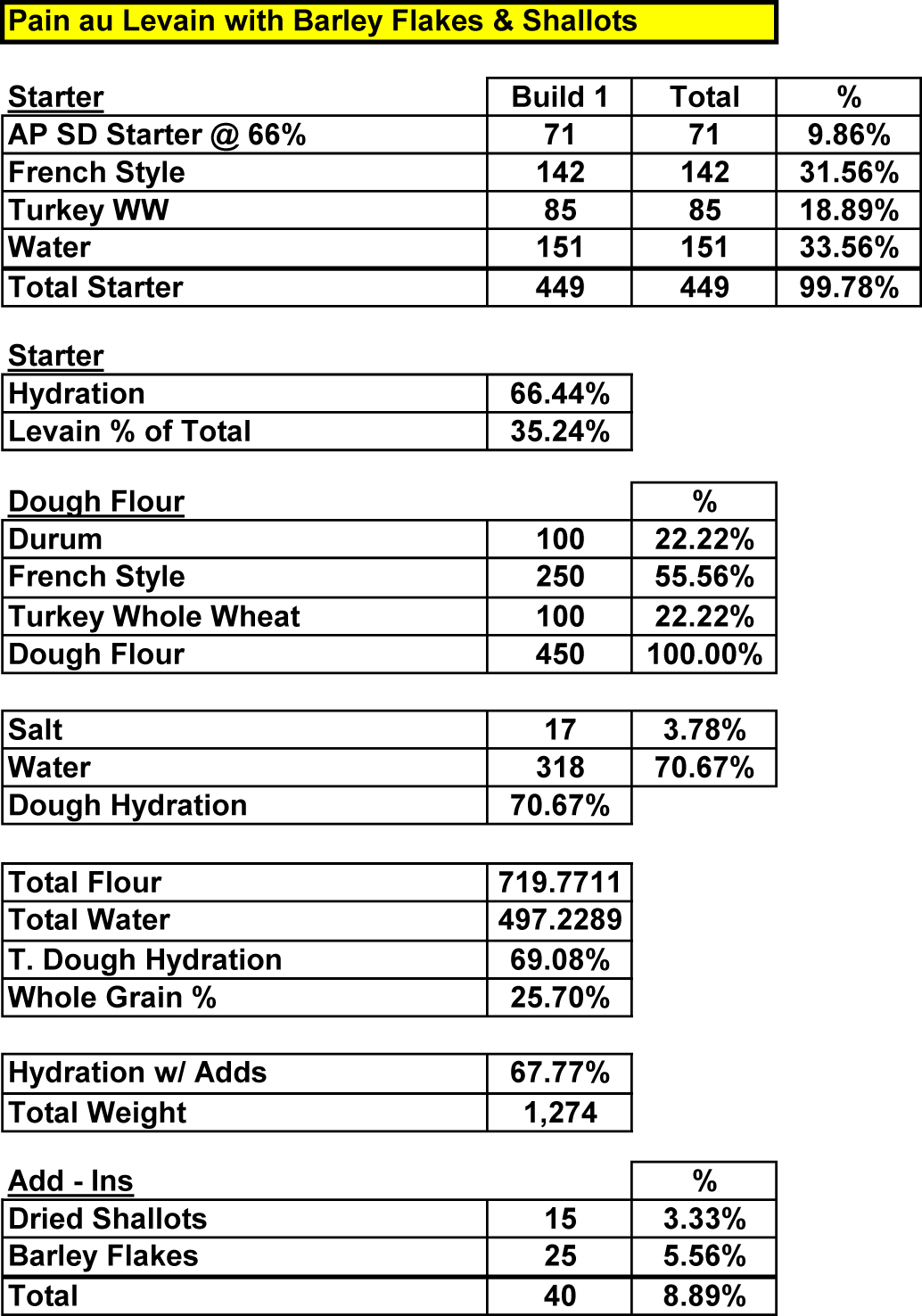Add the dried shallots to your water and let it re-hydrate for about 10 minutes. Next, mix the flour, barley flakes, and 275 grams of the water together in your mixer or by hand until it just starts to come together, maybe about 1 minute. Let it rest in your work bowl covered for 20-30 minutes. Next add the salt, starter (cut into about 7-8 pieces) and mix on low for a minute. Add the rest of the water unless the dough is way too wet. Mix on low-speed for another 5 minutes. Remove the dough from your bowl and place it in a lightly oiled bowl or work surface and do several stretch and folds. Let it rest covered for 10-15 minutes and then do another stretch and fold. Let it rest another 10-15 minutes and do one additional stretch and fold. After a total of 2 hours place your covered bowl in the refrigerator and let it rest for 12 to 24 hours.