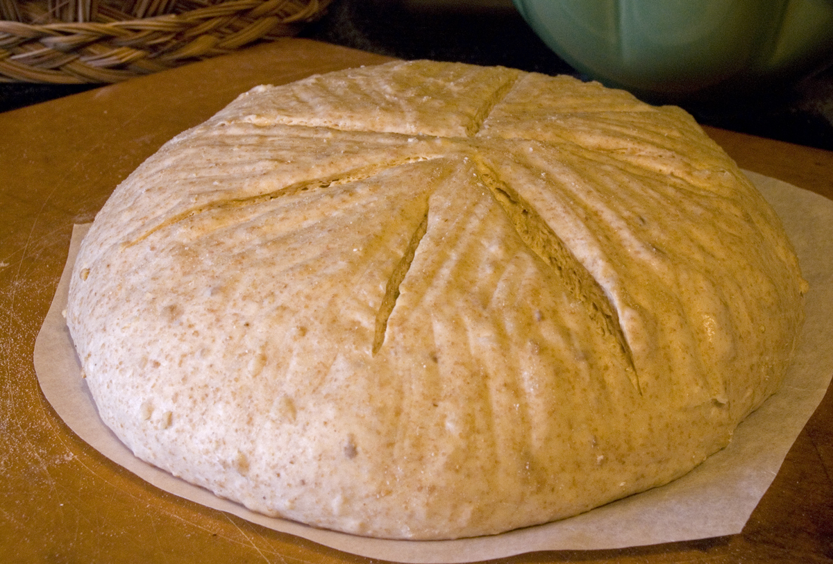 After 1 minute lower the temperature to 500 degrees and after another 3 minutes lower it to 450 degrees. Bake for 35-50 minutes until the crust is nice and brown and the internal temperature of the bread is 210 degrees.